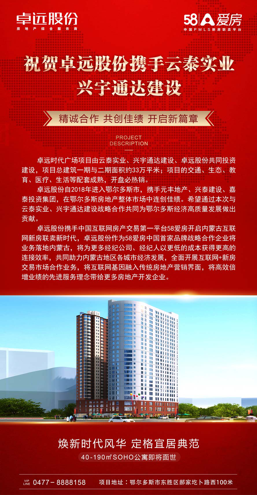 卓遠(yuǎn)股份攜手中國(guó)互聯(lián)網(wǎng)房產(chǎn)交易第一平臺(tái)58愛房開啟內(nèi)蒙古互聯(lián)網(wǎng)新房聯(lián)賣新時(shí)代,卓遠(yuǎn)股份作為58愛房中國(guó)首家品牌戰(zhàn)略合作企業(yè)將業(yè)務(wù)落地內(nèi)蒙古,將為更多經(jīng)紀(jì)公司、經(jīng)紀(jì)人以更低的成本獲得更高的連接效率,共同助力內(nèi)蒙古地區(qū)各城市經(jīng)濟(jì)發(fā)展,全面開展互聯(lián)網(wǎng)+新房交易市場(chǎng)合作業(yè)務(wù),將互聯(lián)網(wǎng)基因融入傳統(tǒng)房地產(chǎn)營(yíng)銷界面,將高效倍增業(yè)績(jī)的先進(jìn)服務(wù)理念帶給更多房地產(chǎn)開發(fā)企業(yè)。