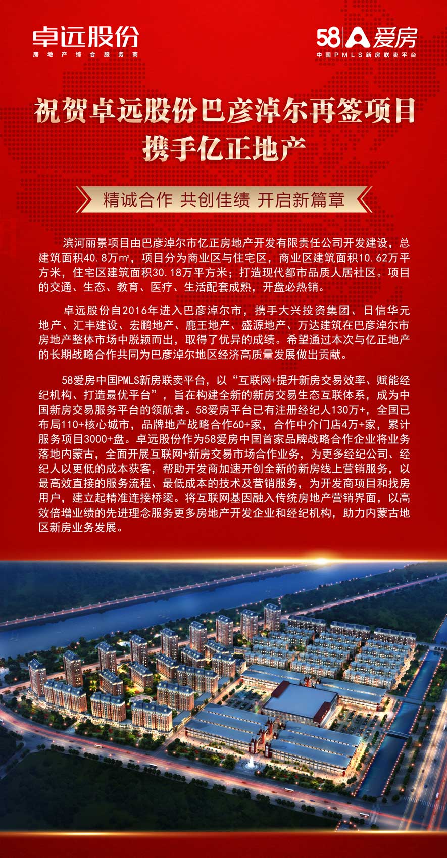 58愛房中國(guó)PMLS新房聯(lián)賣平臺(tái),以“互聯(lián)網(wǎng)+提升新房交易效率、賦能經(jīng)紀(jì)機(jī)構(gòu)、打造最優(yōu)平臺(tái)”,旨在構(gòu)建全新的新房交易生態(tài)互聯(lián)體系,成為中國(guó)新房交易服務(wù)平臺(tái)的領(lǐng)航者。58愛房平臺(tái)已有注冊(cè)經(jīng)紀(jì)人130萬+,全國(guó)已布局110+核心城市,品牌地產(chǎn)戰(zhàn)略合作60+家,合作中介門店4萬+家,累計(jì)服務(wù)項(xiàng)目3000+盤。卓遠(yuǎn)股份作為58愛房中國(guó)首家品牌戰(zhàn)略合作企業(yè)將業(yè)務(wù)落地內(nèi)蒙古,全面開展互聯(lián)網(wǎng)+新房交易市場(chǎng)合作業(yè)務(wù),為更多經(jīng)紀(jì)公司、經(jīng)紀(jì)人以更低的成本獲客,幫助開發(fā)商加速開創(chuàng)全新的新房線上營(yíng)銷服務(wù),以最高效直接的服務(wù)流程、最低成本的技術(shù)及營(yíng)銷服務(wù),為開發(fā)商項(xiàng)目和找房用戶,建立起精準(zhǔn)連接橋梁。將互聯(lián)網(wǎng)基因融入傳統(tǒng)房地產(chǎn)營(yíng)銷界面,以高效倍增業(yè)績(jī)的先進(jìn)理念服務(wù)更多房地產(chǎn)開發(fā)企業(yè)和經(jīng)紀(jì)機(jī)構(gòu),助力內(nèi)蒙古地區(qū)新房業(yè)務(wù)發(fā)展。