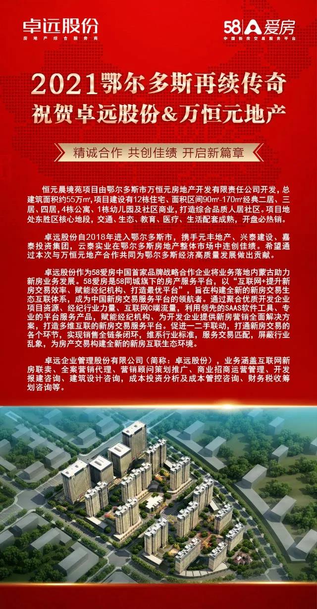卓遠(yuǎn)股份自2018年進(jìn)入鄂爾多斯市,攜手元豐地產(chǎn)、興泰建設(shè)、嘉泰投資集團(tuán),云泰實(shí)業(yè)在鄂爾多斯房地產(chǎn)整體市場中連創(chuàng)佳績。希望通過本次與萬恒元地產(chǎn)合作共同為鄂爾多斯經(jīng)濟(jì)高質(zhì)量發(fā)展做出貢獻(xiàn)。